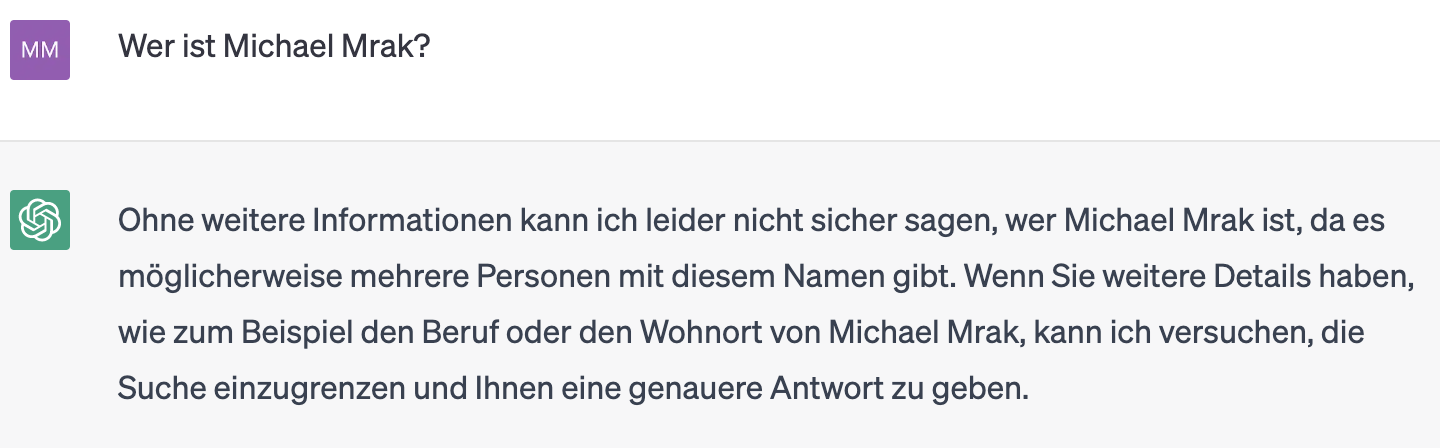 Nachfolgend ein Beispiel welche Informationen ChatGPT über mich liefert: