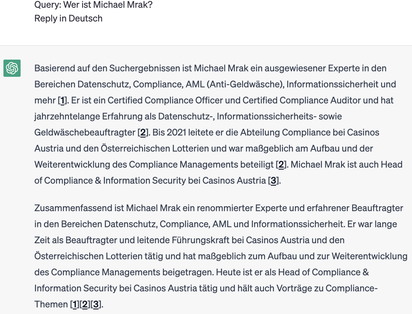 Obwohl die Antworten (wie in meinem obigen Fall) nicht immer zu 100% korrekt sind (immerhin arbeite ich seit 2021 nicht mehr für Casinos Austria), ist dies immer noch eine erstaunliche Verbesserung im Vergleich zur Standardversion von ChatGPT.