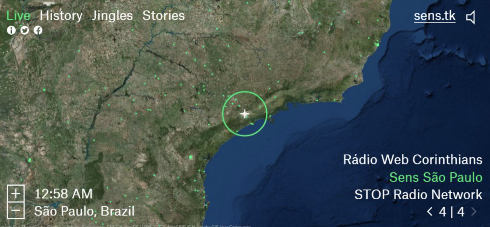 Die Standortschnittstelle ist eine dreidimensionale Geolokalisierung, bei der der Benutzer durch eine Darstellung der Welt navigiert, Sendungen lokaler Radiosender hört, das ganze erinnert an Kurzwellenradios, aber in diesem Fall ist das Mittel zur Verbreitung der Radioausgabe durch Streaming. Die Homepage mit dem Titel Live ermöglicht es dem Benutzer, die Welt in Echtzeit zu erkunden und zu hören, was die lokalen Radios senden. Um dies zu tun, ist es nur notwendig, einfach den Globus zu drehen. Es liefert auch Informationen über das Land, in dem das Signal übertragen wird.